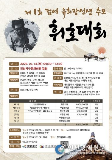 ‘제1회 검여 유희강 선생 추모 휘호대회’는 2026년 3월 14일 인천서구문화회관 일원에서 개최된다. 만 19세 이상 성인이라면 누구나 참가할 수 있다. 대회는 한문서예 · 한글서예 2개 부문으로 구성되며, 참가비는 무료다.