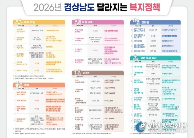 [인천광역신문] 관리자 기자 | 경상남도는 도민복지 향상과 취약계층 사회안전망 강화를 핵심으로 하는 ‘2026년 복지 분야 달라지는 시책’으로 6개 복지분야별 34개의 제도와 지원계획을 발표했다.