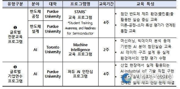 다음으로, ‘첨단분야 글로벌 교육과정 운영사업’은 국내외 대학이 공동으로 반도체, 인공지능(AI) 등 첨단분야와 관련된 해외 교육과정을 기획·운영하는 사업이다. 선발된 학생은 해외 대학에서 실습형 교육과정, 현지 기업 현장 방문, 한인 재직자 간담회 등의 국제 프로그램에 참여하게 된다. 올해는 대학이 추천한 우수 학생 중 120명을 최종 선발하여, 퍼듀대학교(미국), 토론토대학교(캐나다)와 연계해 다양한 교육 경험을 지원할 계획이다.