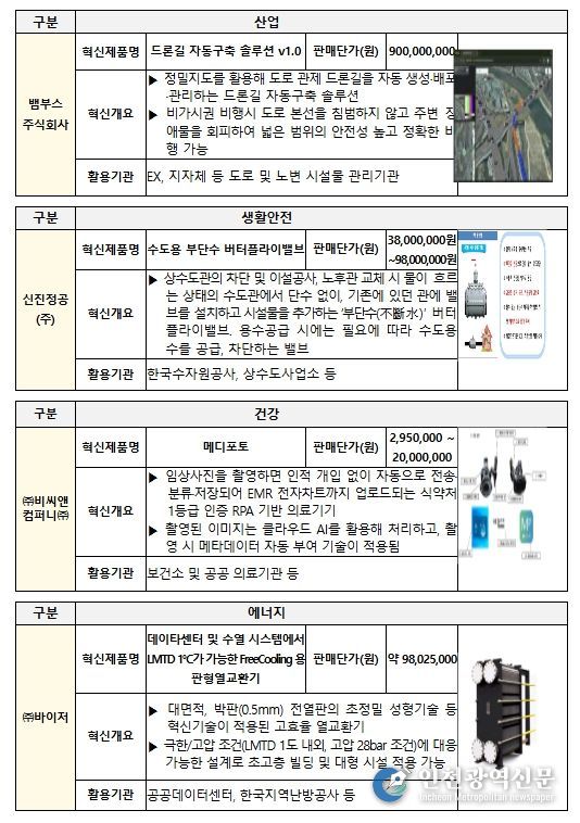 중기부는 2025년에 정밀지도를 활용해 도로 관제 드론길을 자동 생성・배포・관리하는 ‘드론길 자동구축 솔루션’, 상수도관의 차단 및 이설공사, 노후관 교체 시 수도관 단수 없이 기존에 있던 관에 밸브를 설치하고 시설물을 추가하는 ‘수도용 부단수 버터플라이밸브’ 등 총 95개의 우수 제품을 혁신제품으로 지정했다.