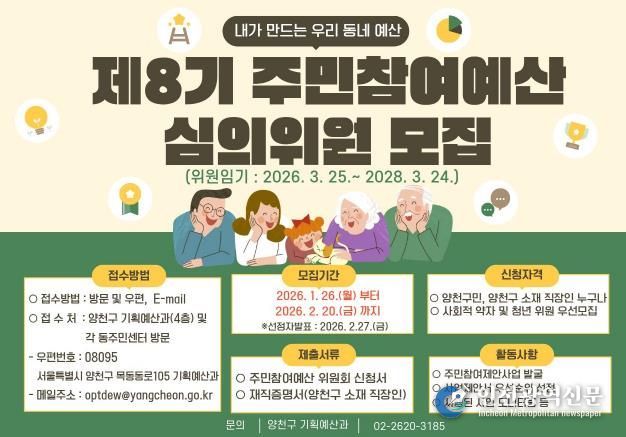 [인천광역신문] 관리자 기자 | 양천구는 주민의 아이디어가 예산에 반영되고 실제 사업 실행으로 이어지는 ‘주민참여예산제도’를 함께 이끌어갈 ‘제8기 주민참여예산 심의위원’을 2월 20일까지 모집한다고 밝혔다.