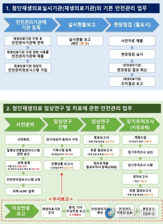 '첨단재생의료실시기관 안전관리 업무안내서'에서는 첨단재생의료실시기관으로 지정되고 임상연구를 승인받은 이후에 시설·장비·인력 운영, 연구계획에 따른 사전 동의 절차, 환자 건강상태 모니터링시 준수해야 할 사항 등을 사례 중심으로 구체적으로 안내하고 있다.