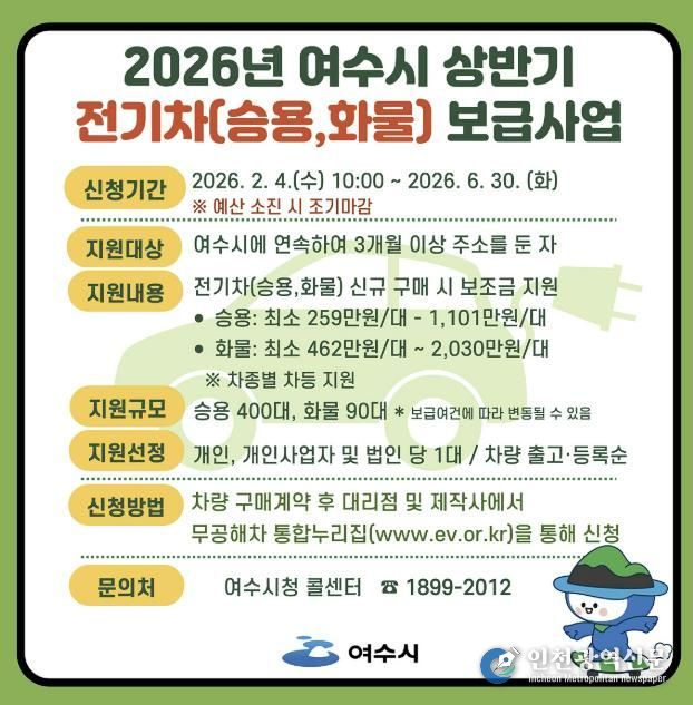 [인천광역신문] 관리자 기자 | 여수시가 교통부문 탄소중립 실현과 대기질 개선을 위해 2026년 상반기 전기자동차 구매보조금 지원사업을 추진한다. 올해 상반기 지원 규모는 전기승용차 400대, 전기화물차 90대로, 지난해보다 1.5배 이상 확대됐다.