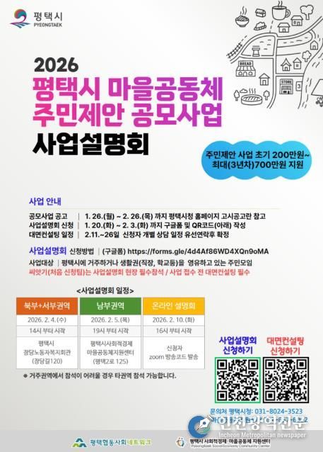 [인천광역신문] 관리자 기자 | 평택시는 주민들이 스스로 만들어가는 만남과 소통의 마을 공간에서 지속이 가능한 공동체 활동을 지원하고자, 지난 27일부터 녪년 평택시 마을공동체 주민제안 공모사업’을 추진한다고 밝혔다.