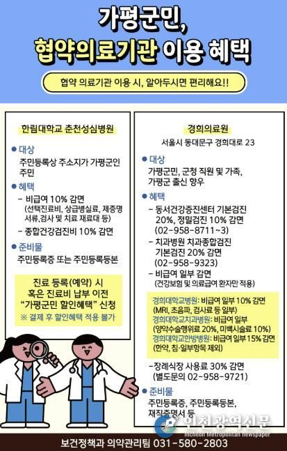 [인천광역신문] 관리자 기자 | 가평군은 24시간 응급실과 심야약국 운영, 협약병원 감면 혜택을 다시 한번 종합적으로 안내하며 군민들의 적극적인 이용을 당부했다. 기존부터 시행중인 제도들이지만 군민들이 내용을 정확히 알지 못해 이용하지 못하는 사례를 줄이기 위해서다.