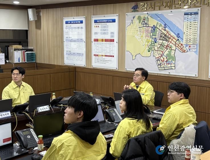 [인천광역신문] 관리자 기자 | 진교훈 서울 강서구청장이 1일 밤부터 2일 새벽 사이에 서울 전역에 많은 눈이 내릴 것이 예보됨에 따라 구 제설대책본부를 찾아 제설대응 체계를 점검했다.
