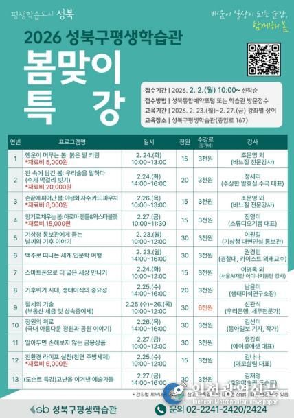 [인천광역신문] 관리자 기자 | 서울 성북구가 구민의 평생학습 참여를 확대하고 일상 속 평생학습 문화를 확산하기 위해 ‘2026 성북구평생학습관 봄맞이 특강’을 운영한다.
