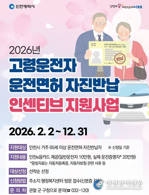 [인천광역신문] 관리자 기자 | 인천광역시는 고령운전자의 교통사고 예방과 안전한 교통환경 조성을 위해 고령자 운전면허 자진반납 제도 장려금을 2026년부터 최대 20만 원까지 확대해 시행한다고 밝혔다.