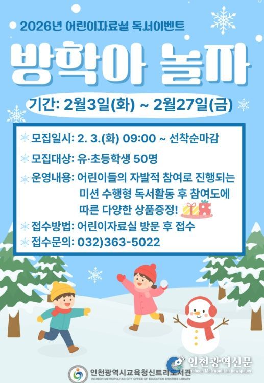 [인천광역신문] 관리자 기자 | 인천광역시교육청신트리도서관은 2월 3일부터 27일까지 어린이들의 독서 습관 형성을 위한 겨울방학 이벤트 ‘방학아 놀자’를 운영한다.