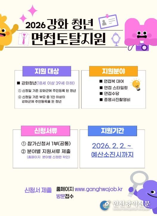 '강화 청년 면접 지원-면접 토탈 솔루션'은 2026년 취업을 준비하는 강화 청년들에게 취업 준비에 따른 비용 부담과 스트레스를 덜어주기 위해 추진됐으며, ▲증명사진 촬영비 지원 ▲면접복 대여 ▲면접 스타일링 ▲면접 수당 지원 ▲AI 자기소개서 · 면접 체험 등 다양한 프로그램으로 청년들을 맞이한다.