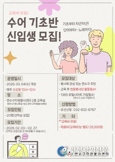 이번 교육은 수어의 기초 단어부터 노래를 활용한 실습까지 초보자도 쉽게 배울 수 있는 내용으로 구성됐으며, 3월 4일 개강해 매주 수요일 오전 10시부터 12시까지 연수구자원봉사센터 2층 교육실에서 진행된다.