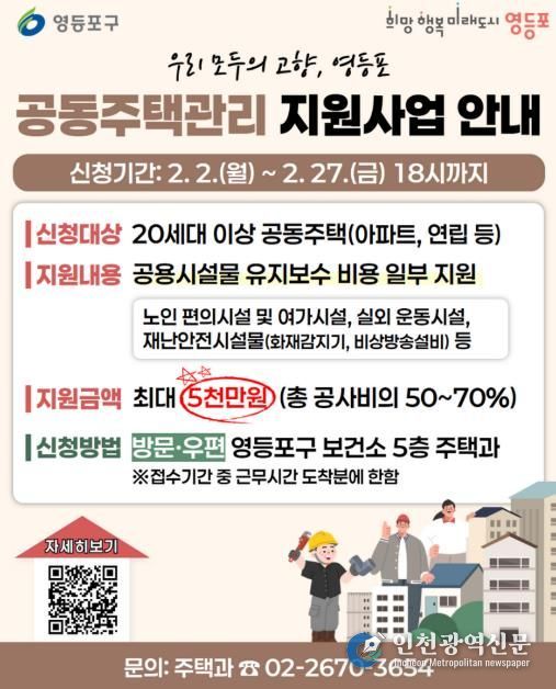 [인천광역신문] 관리자 기자 | 영등포구가 공동주택 주민의 쾌적하고 안전한 생활여건 조성을 위해 ‘2026년 공동주택관리 지원사업’을 추진한다고 밝혔다.