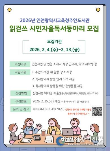 [인천광역신문] 관리자 기자 | 인천광역시교육청주안도서관은 지역주민의 자발적 독서문화 확산을 위하여 2월 4일부터‘2026년 읽걷쓰 시민자율독서동아리’를 모집한다.
