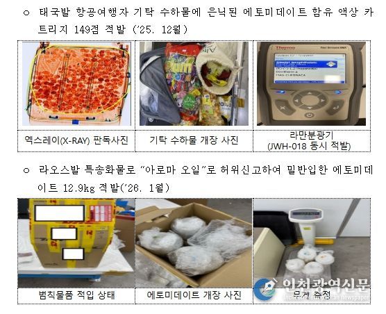 최근 관세청은 태국발 항공여행자의 기탁수하물에서 에토미데이트 성분이 함유된 액상 카트리지 149점을 적발했고, 라오스발 특송화물에서도 아로마오일로 위장한 에토미데이트를 잇따라 적발했다고 밝혔다.