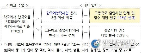 베트남 대입제도는 우리나라의 대학수학능력시험에 해당하는 전국 단위 시험인 ‘고등학교 졸업시험’을 중심으로 운영된다. 베트남 학생들은 졸업시험 과목 중 수학과 국어(베트남어)는 필수로 응시하고, 외국어·역사 등 9개 과목 중 2개를 선택해 총 4개 과목에 응시한다. 이번 결정은 한국어능력시험 성적으로 졸업시험 외국어 과목을 대체할 수 있다는 내용이다. 즉, 한국어능력시험에서 토픽(TOPIK) 3급 이상 취득한 학생은 졸업시험 선택과목 1개를 면제받고 환산된 한국어능력시험 점수를 졸업시험 성적으로 인정받을 수 있다.