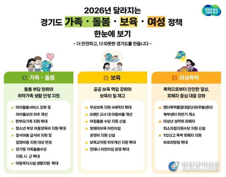 [인천광역신문] 관리자 기자 | 경기도는 올해 여성폭력, 가족‧돌봄, 보육 분야에 걸쳐 총 16개 제도를 개선하거나 신규 도입한다고 4일 밝혔다.