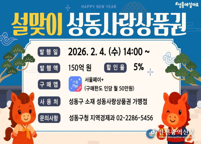 [인천광역신문] 관리자 기자 | 서울 성동구는 2026년 설 명절을 맞아 주민들의 장바구니 물가 부담을 덜고 지역 상권에 활력을 불어넣기 위해 2월 4일 오후 2시, 150억 원 규모의 ‘2026년 성동사랑상품권’을 발행한다고 밝혔다.