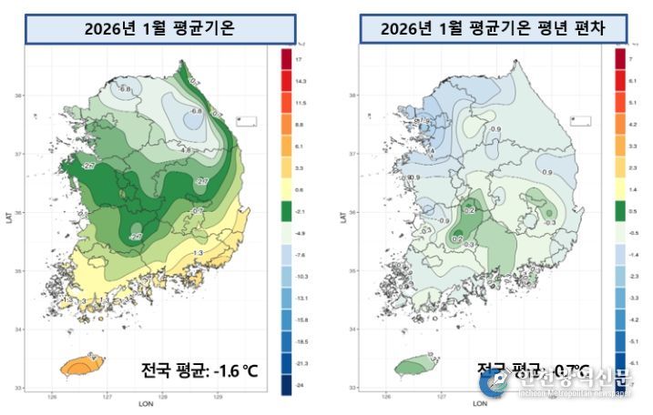 1월 전국 평균기온은 -1.6 ℃로 평년보다 0.7 ℃ 낮았고, 지난해(-0.2 ℃)보다 1.4 ℃ 낮았다. 지난 10년(2016∼2025년) 동안 1월 평균기온은 2018년(-2.4 ℃)을 제외하고 평년과 비슷하거나 높았다(비슷: 5, 높음: 4개 해). 2025년 6월부터 12월까지 7개월 연속 평년보다 높은 기온이 이어졌던 반면에, 올해 1월은 하순에 강한 추위가 열흘 이상 지속되면서 이례적으로 평년보다 낮았다.