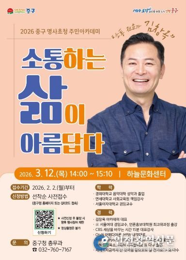 [인천광역신문] 관리자 기자 | 인천시 중구는 오는 3월 12일 오후 2시 하늘문화센터에서 소통 전문가 김창옥과 함께하는 올해 첫 번째 ‘중구 명사 초청 주민아카데미’를 개최한다고 밝혔다.