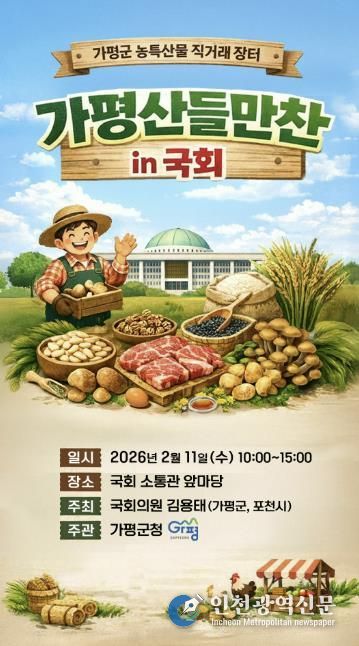 [인천광역신문] 관리자 기자 | 설 명절을 앞두고 가평군의 우수 농특산물을 한자리에서 만날 수 있는 직거래 장터가 국회에서 열린다. 소비자와 생산자를 직접 연결하는 이번 행사는 도시민들에게 가평 농산물의 우수성과 가평의 관광자원까지 함께 알리는 자리가 될 전망이다.