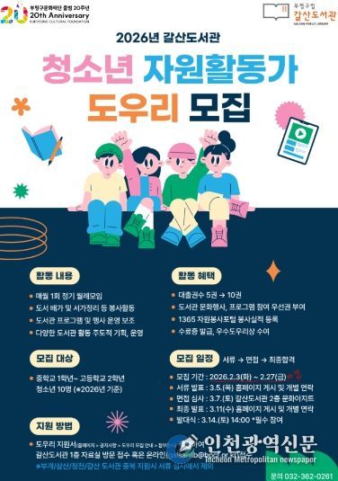 [인천광역신문] 관리자 기자 | 부평구립 갈산도서관은 오는 27일까지 청소년 자원활동가 ‘도우리’를 모집한다고 밝혔다.