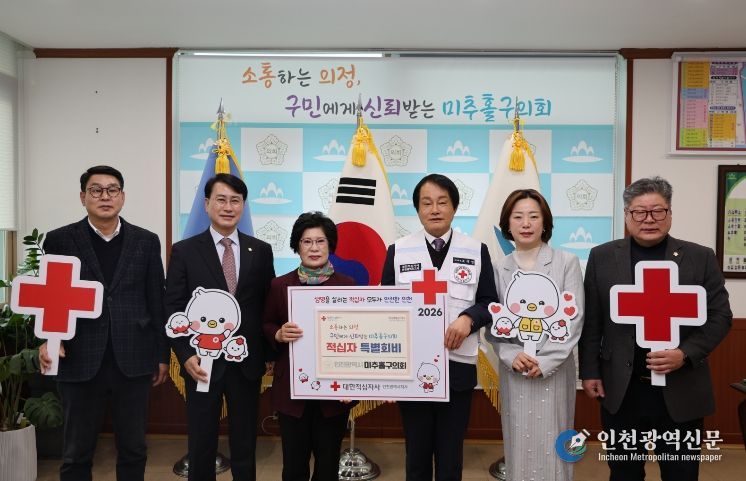[인천광역신문] 관리자 기자 | 인천광역시 미추홀구의회는 2월 4일 의회 의장실에서 전경애 의장과 장규철 부의장을 비롯한 상임위원장들과 조의영 대한적십자사 인천지사 회장 및 조혜정 적십자봉사회 미추홀지구협의회 회장과 관계 임원들이 참석한 가운데 2026년도 적십자 특별회비 전달식을 개최했다.