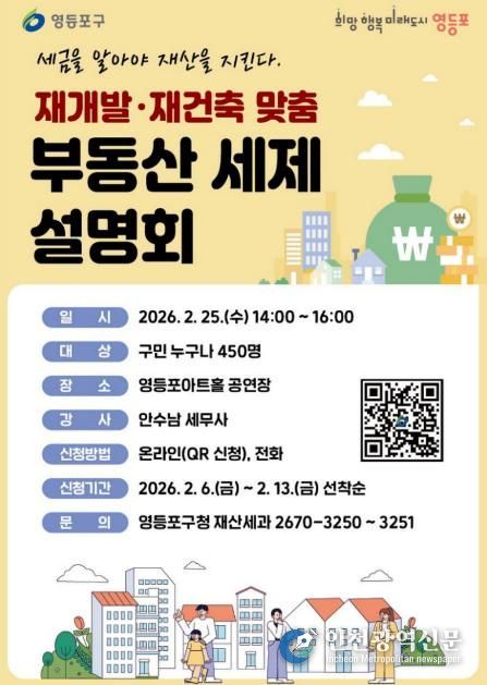 [인천광역신문] 관리자 기자 | 영등포구가 영등포 전역에서 87개 재개발 재건축 등 정비사업이 추진되면서 높아진 부동산 세제에 대한 관심에 부응하고자, 오는 25일 영등포 아트홀에서 ‘재개발 재건축 맞춤 부동산 세제 설명회’를 개최한다고 밝혔다.