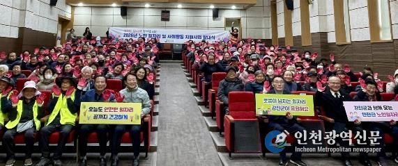 사회자의 구호에 맞춰 “머리안전-모자착용”, “손보호-장갑착용”, “몸안전-조끼착용”을 함께 외치고, 강진원 군수가 노인일자리 대표에게 모자·코팅장갑·형광조끼를 착용시키는 방식으로 진행된 퍼포먼스는 참여자들이 안전수칙을 쉽고 명확하게 체득하도록 했다.
