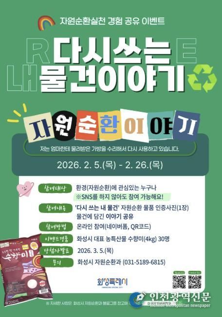 [인천광역신문] 관리자 기자 | 화성특례시는 시민들이 일상에서 실천하고 있는 자원순환 경험을 공유하는 참여형 캠페인 '다시쓰는 내 물건 이야기' 를 운영한다.