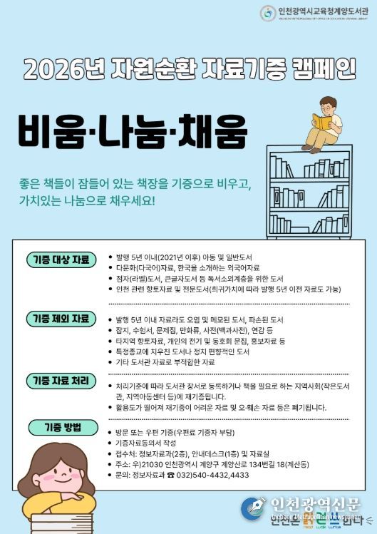[인천광역신문] 관리자 기자 | 인천광역시교육청계양도서관은 시민과 지역사회가 함께하는 자원순환형 독서문화 확산을 위해 2026년 자료기증 캠페인 ‘비움·나눔·채움’을 연중 운영한다고 5일 밝혔다.