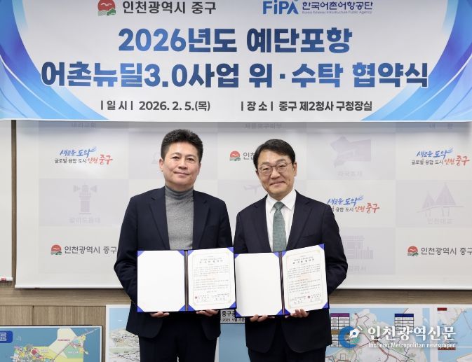 김정헌 인천 중구청장과 홍종욱 한국어촌어항공단 이사장은 5일 오전 중구 제2청 구청장실에서 ‘예단포항 어촌뉴딜3.0 사업 위·수탁 협약’을 체결했다.