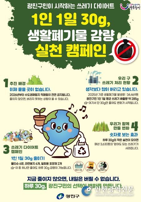 [인천광역신문] 관리자 기자 | 광진구는 수도권 생활폐기물 직매립 전면 금지 시행에 선제적으로 대응하기 위해, 전년 대비 생활쓰레기 6% 감량을 목표로 구민과 함께하는 '1인 1일 30g 쓰레기 다이어트, ‘1.1.30.쓰다 캠페인’'을 본격 추진한다.