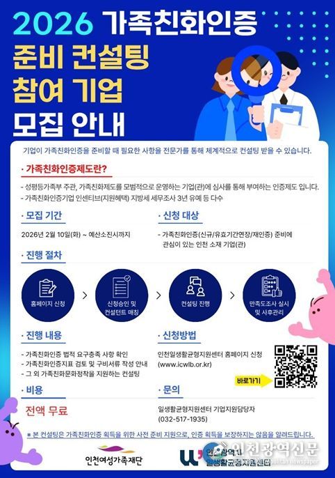 [인천광역신문] 관리자 기자 | (재)인천여성가족재단 인천일생활균형지원센터가 2026년도 가족친화인증 준비 컨설팅 참여 기업 모집을 시작한다.