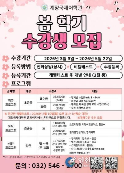 [인천광역신문] 관리자 기자 | 인천 계양국제어학관이 2026년 봄 학기 프로그램 수강생을 모집한다고 밝혔다.