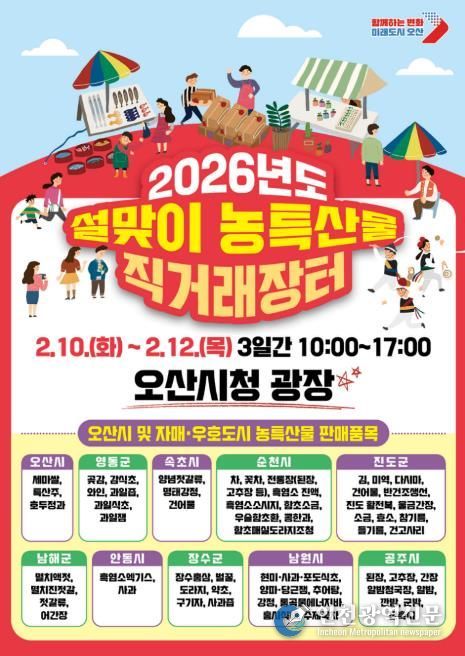 [인천광역신문] 관리자 기자 | 오산시는 설 명절을 맞아 오는 2월 10일부터 12일까지 3일간, 오전 10시부터 오후 5시까지 오산시청 광장에서 자매·우호도시와 함께하는 ‘설맞이 농특산물 직거래장터’를 개최한다고 밝혔다.