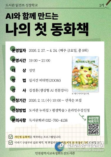 [인천광역신문] 관리자 기자 | 인천광역시교육청화도진도서관은 오는 27일부터 성인 대상 2026년 읽걷쓰 성장학교 1기 ‘AI와 함께 만드는 나의 첫 동화책’ 프로그램을 운영한다.