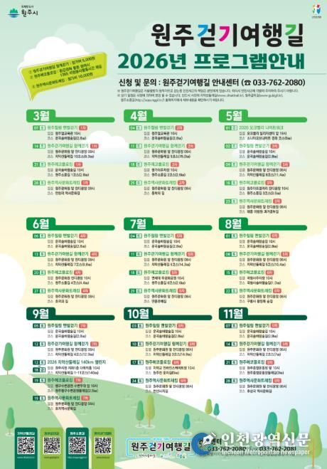 [인천광역신문] 관리자 기자 | 트레킹 도시 원주시는 3월부터 11월까지 ‘2026년 원주걷기여행길 프로그램’을 운영한다. 이번 프로그램은 원주의 역사·문화·생태 자원을 직접 보고, 느끼고, 체험하는 활동을 통해 걷기 운동을 확산하고 시민 건강 증진에 기여하는 것을 목표로 한다.