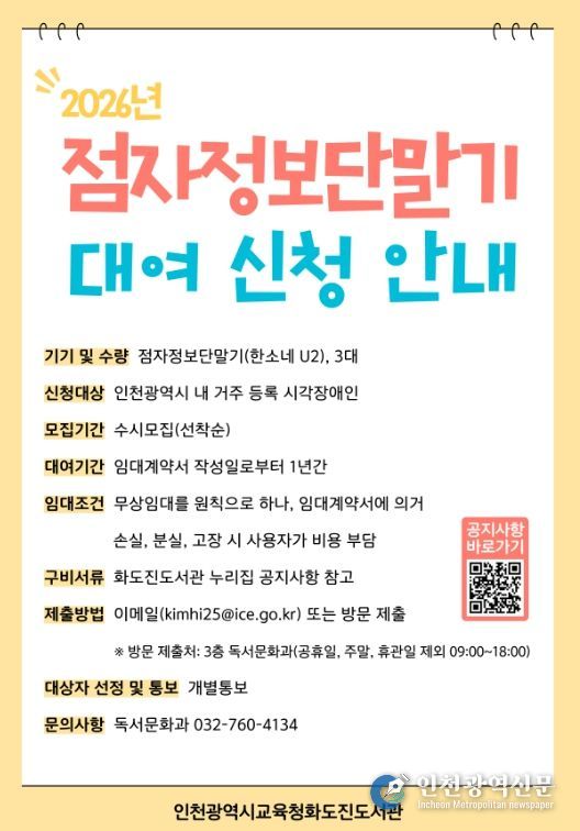 [인천광역신문] 관리자 기자 | 인천광역시교육청화도진도서관은 인천 거주 시각장애인을 대상으로 ‘점자정보단말기 무상대여 사업’을 운영한다고 9일 밝혔다.