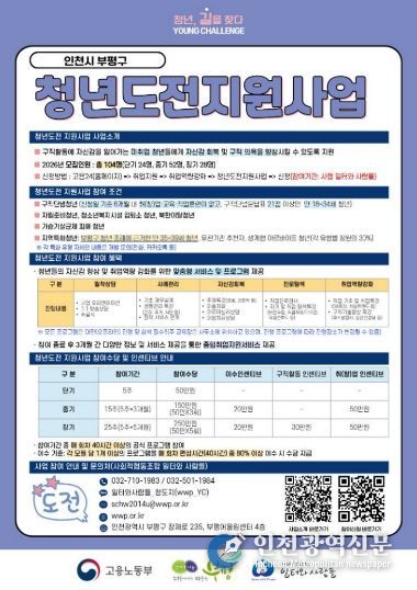 [인천광역신문] 관리자 기자 | 부평구는 오는 10월까지 구직에 어려움을 겪고 있는 지역 청년들의 사회 재진입을 돕기 위한 ‘2026년 청년도전지원사업’ 참여자를 모집한다고 밝혔다.