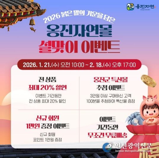 이번 할인 행사는 2월 18일 17시까지 이어지며, 자세한 내용은 옹진자연몰 홈페이지 통해 확인할 수 있다.