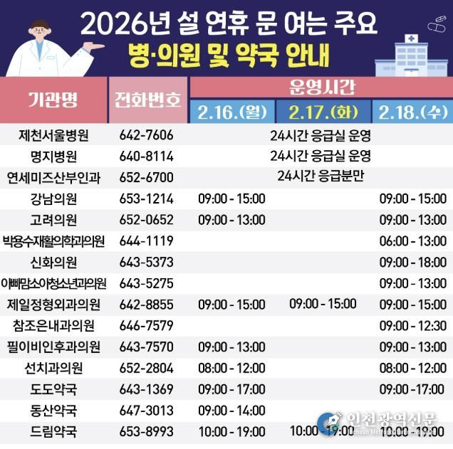 [인천광역신문] 관리자 기자 | 설 명절을 앞두고 제천시가 연휴 기간 응급의료 공백을 최소화하기 위한 대응에 나선다. 제천시보건소는 이번 설 연휴 동안 시민과 귀성객이 의료 이용에 불편을 겪지 않도록 안전하고 빈틈없는 설 연휴 응급진료체계를 구축해 총력 대응에 나선다고 밝혔다.