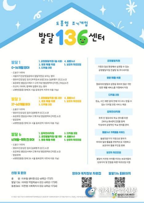 [인천광역신문] 관리자 기자 | 서울 도봉구가 미취학 영유아를 대상으로 생애주기 맞춤형 조기개입 ‘발달 136 사업’을 추진한다.