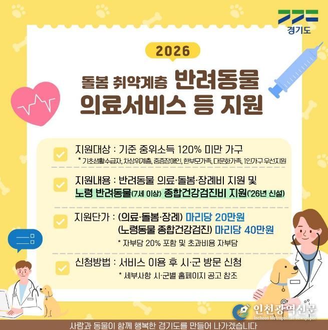 [인천광역신문] 관리자 기자 | 경기도가 올해부터 기초생활수급자나 중증장애인 등 사회적 배려계층이 키우는 7세 이상 노령 반려동물에 대한 종합건강검진비를 지원한다.