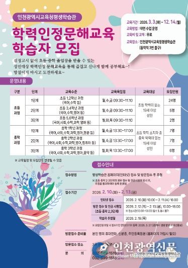 [인천광역신문] 관리자 기자 | 인천광역시교육청평생학습관은 2월 10일부터 13일까지 ‘2026년 초등·중학 학력인정 문해교육’ 학습자를 모집한다