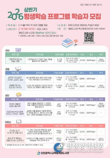 [인천광역신문] 관리자 기자 | 인천광역시교육청계양도서관은 학생과 지역주민에게 다양한 배움과 자기계발의 기회를 제공하기 위하여 오는 19일부터 ‘2026년 상반기 평생학습 프로그램’학습자를 모집한다.