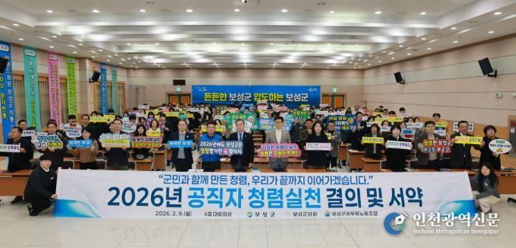 [인천광역신문] 관리자 기자 | 보성군은 지난 9일 보성군청 대회의실에서 보성군, 보성군의회, 보성군공무원노동조합이 공동 참여한 ‘2026년 반부패·청렴 실천 결의 및 서약식’을 개최했다고 밝혔다.