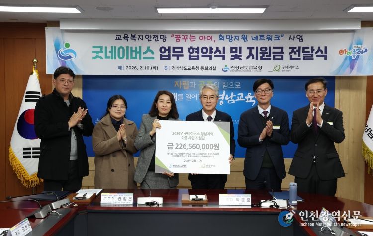 [인천광역신문] 관리자 기자 | 경상남도교육청은 10일 본청 중회의실에서 굿네이버스 경남사업본부와 업무 협약을 맺고 지원금 전달식을 열었다. 이번 행사는 교육복지안전망인 ‘꿈꾸는 아이, 희망지원 네트워크’ 사업의 하나로 마련했다.