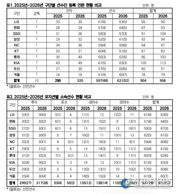 [인천광역신문] 관리자 기자 | KBO는 2월 10일(화) 2026년 KBO 리그 소속 선수 명단을 공시했다. 10개 구단은 총 621명의 선수를 등록해, 597명이 등록했던 2025년보다 24명이 늘어났다.