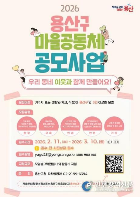 [인천광역신문] 관리자 기자 | 서울 용산구는 주민 주도의 지역 문제 해결을 지원하기 위해 ‘2026년 용산구 마을공동체 공모사업’ 참여자를 모집한다.