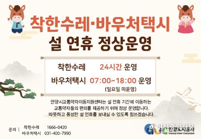 [인천광역신문] 관리자 기자 | 안양시는 2월 14일부터 18일까지 설 명절 연휴 기간에도 ‘착한수레’와 ‘바우처택시’를 정상 운영한다고 11일 밝혔다. 두 교통수단은 대중교통 이용이 어려운 장애인·임산부·영유아 등 교통약자의 병원 진료, 등·하교, 출·퇴근 등 일상 이동을 지원한다.